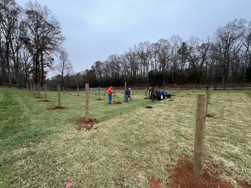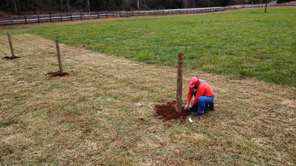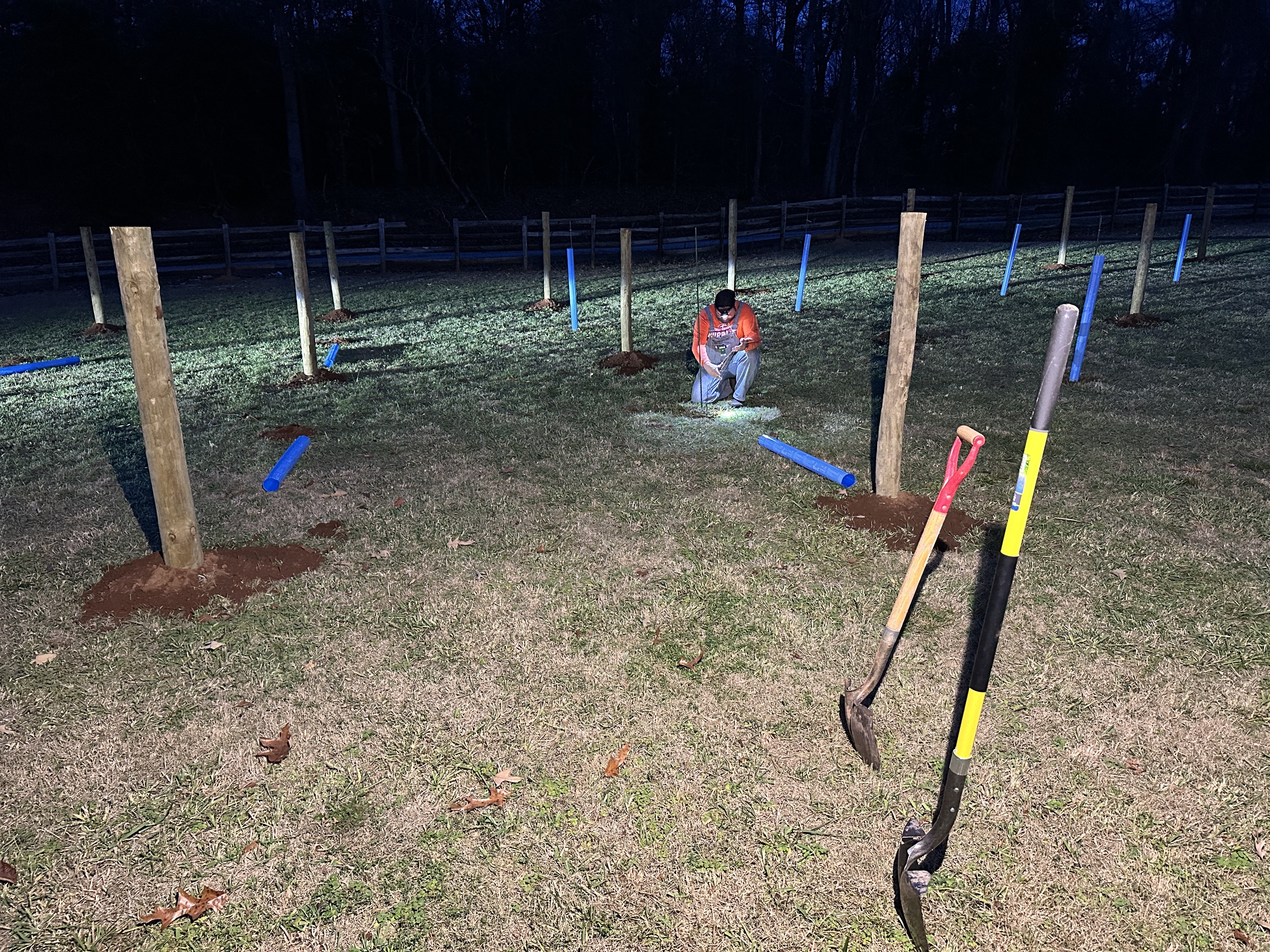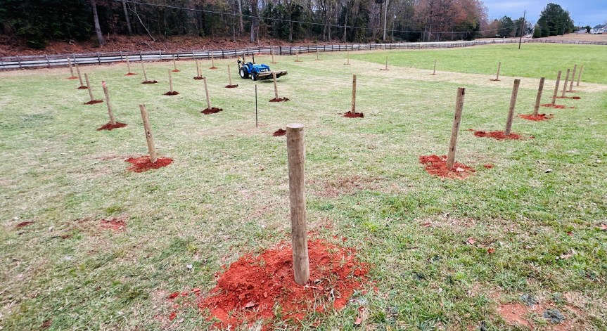 Just wrapped up a weekend of hard work installing 48 wood posts for the second phase of our new Muscadine vineyard! The vineyard will be 8,400 square feet and hold over 40 Muscadine vines, ranging in varieties. Check out the pictures below to see how the vineyard is coming along!