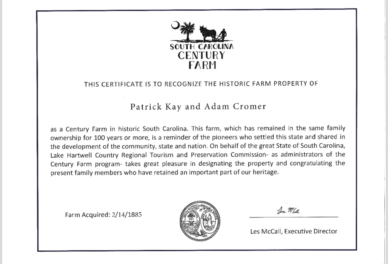 Kay Farm was recently designated as a South Carolina Century Farm! It is an honor to be recognized as a working farm that has remained in the same family ownership since 1885. This designation is a tribute to our family who settled in this area and shared in the development of the community. We take pride in our work and those who came before us to lay the foundation for Kay Farm. Everything that we do is to honor the legacy that the Kay family left behind.